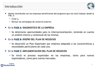 El documento detalla el desarrollo de una estrategia exportadora para pymes en Buenos Aires, enfocándose en la creación y revisión de planes de exportación personalizados para cada empresa. Se presentan resultados destacados de diversas pymes, incluyendo acuerdos de exportación y la identificación de oportunidades en mercados internacionales. El trabajo colaborativo con un equipo multidisciplinario y la creación de redes de contactos facilitaron el inicio de operaciones de comercio exterior para estas empresas.