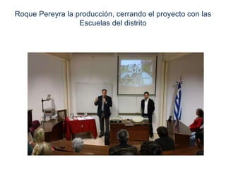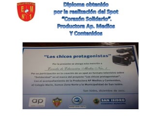 El documento habla sobre la producción de unos spots solidarios realizados por estudiantes de escuelas del distrito. Los spots fueron presentados y cada escuela involucrada recibió un DVD con los videos y un reconocimiento. Los estudiantes de la EEMN 1 participaron en el rodaje y estuvieron presentes en la reunión de cierre del proyecto.