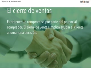 El cierre de ventas implica obtener un compromiso del cliente y ayudarle a tomar decisiones de compra, enfrentando dificultades como el miedo al rechazo y la falta de preparación. Existen diversas técnicas de cierre, tanto verbales como no verbales, adaptadas a la situación y necesidades del cliente. La post venta es esencial para desarrollar relaciones a largo plazo con los clientes, asegurando su satisfacción y fomentando futuras recomendaciones.