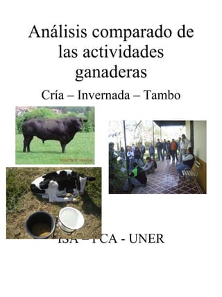 El documento contiene información sobre diferentes actividades ganaderas como cría, invernada y tambo. Se describen las principales y secundarias producciones de cada actividad, así como las categorías de animales involucrados. También presenta un caso problema sobre un establecimiento tambero y una lista de acciones a ordenar cronológicamente para mejorar la producción lechera. Por último, detalla los puntos claves a observar en un curso sobre producción lechera como la planificación de la alimentación, sanidad y manejo reproductivo.
