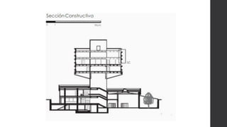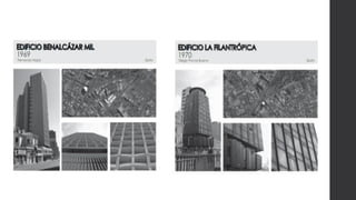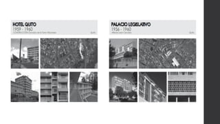 Este documento presenta información sobre la arquitectura moderna en Quito, Ecuador, con énfasis en los arquitectos Milton Barragán y Ovidio Wappenstein. Describe obras representativas como el edificio CIESPAL diseñado por ambos en 1970, reconocido como el ejemplo más importante del estilo brutalista en el país. También presenta biografías de los arquitectos y describe brevemente otros edificios modernos significativos en Quito que marcaron el desarrollo de la ciudad.