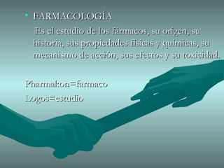 La farmacología estudia los fármacos, su origen, propiedades y efectos. Los fármacos se obtienen de plantas, microorganismos, animales, minerales e incluso síntesis química. La farmacocinética analiza la absorción, distribución, metabolismo y eliminación de los fármacos en el organismo, mientras que la farmacodinámica estudia sus mecanismos y efectos de acción.
