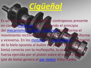 El cigüeñal es un eje presente en máquinas que transforma el movimiento rectilíneo alternativo en circular uniforme y viceversa aplicando el principio de biela-manivela. En los motores de automóviles, el cigüeñal conecta la biela con la muñequilla para generar el par motor. Los cigüeñales son reparados mediante el cambio de bielas, rectificado, tratamiento térmico y control de fisuras. El cigüeñal gira sobre su eje y las bielas para evitar desgaste,