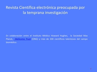 El documento describe e-Life, una revista científica electrónica enfocada en la investigación temprana en las ciencias biomédicas. Es una colaboración entre varias instituciones prominentes y ofrece una plataforma para que investigadores publiquen y reciban comentarios en un plazo de 79 días. La revista es de libre acceso y busca acelerar el progreso científico a través de la generación y difusión de conocimiento útil para la sociedad.