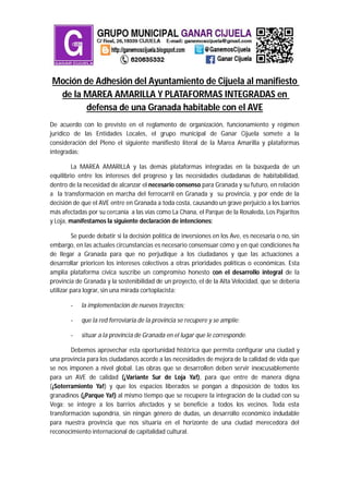 El documento propone que el Ayuntamiento de Cijuela se adhiera a un manifiesto de la Marea Amarilla y otras plataformas a favor de un desarrollo sostenible del AVE en Granada que priorice los intereses de los ciudadanos sobre otras consideraciones. El manifiesto pide mejorar la red ferroviaria provincial, soterramiento de vías en Granada para crear un parque y mejorar la calidad de vida, y establecer una comisión de seguimiento ciudadana de los proyectos ferroviarios.