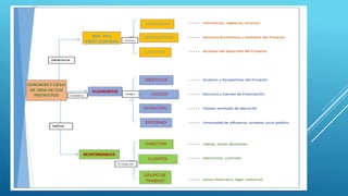 La gerencia de proyectos y su ciclo de vida, incluyendo las fases de inicio, planificación, ejecución, seguimiento, control y cierre. El documento presenta un mapa conceptual sobre estos temas relacionados con la gestión de proyectos de tecnología educativa.