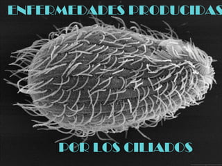 Las enfermedades que pueden producir los ciliados incluyen saprolegniasis en peces, bronquiectasia que es la dilatación del árbol bronquial, rinitis que es la inflamación de la mucosa nasal, bronquitis que es la inflamación de los bronquios, neoplasias cerebelosas que son tumores cerebrales, y toxoplasmosis que es causada por el parásito Toxoplasma gondii.