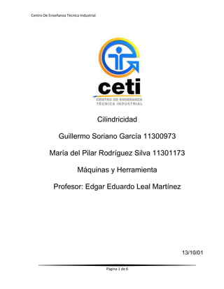 Este documento presenta los procedimientos para realizar una práctica de cilindricidad. Explica que la cilindricidad compara un cilindro real con uno perfecto mediante la rectitud, redondez y conicidad. Describe el equipo utilizado como un indicador de caratula y bloques en V, y los pasos de la práctica como acomodar la pieza en los bloques, medir la rotación y traslación, y registrar los resultados. La pieza medida no pasó la tolerancia de 25 micrómetros.