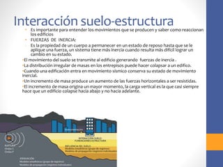El documento trata sobre criterios de diseño estructural para resistir sismos. Explica conceptos como interacción suelo-estructura, zonas sísmicas, sistemas resistentes, ductilidad, torsión, diafragmas de piso y más. El objetivo es entender el comportamiento dinámico de las estructuras durante un terremoto y aplicar principios para mejorar su resistencia sísmica.