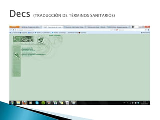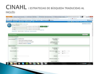 Este documento instruye al lector a buscar artículos sobre el tratamiento hospitalario de infecciones de heridas por cesárea publicados en los últimos 5 años en la base de datos CINAHL. El lector debe crear una entrada de blog con capturas de pantalla de la búsqueda en CINAHL, referencias bibliográficas de al menos 5 artículos en formato Uniform, e imágenes de la primera página de dos artículos completos. Explica los pasos para traducir los términos médicos al sistema DECS y realizar la búsqueda en