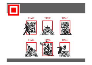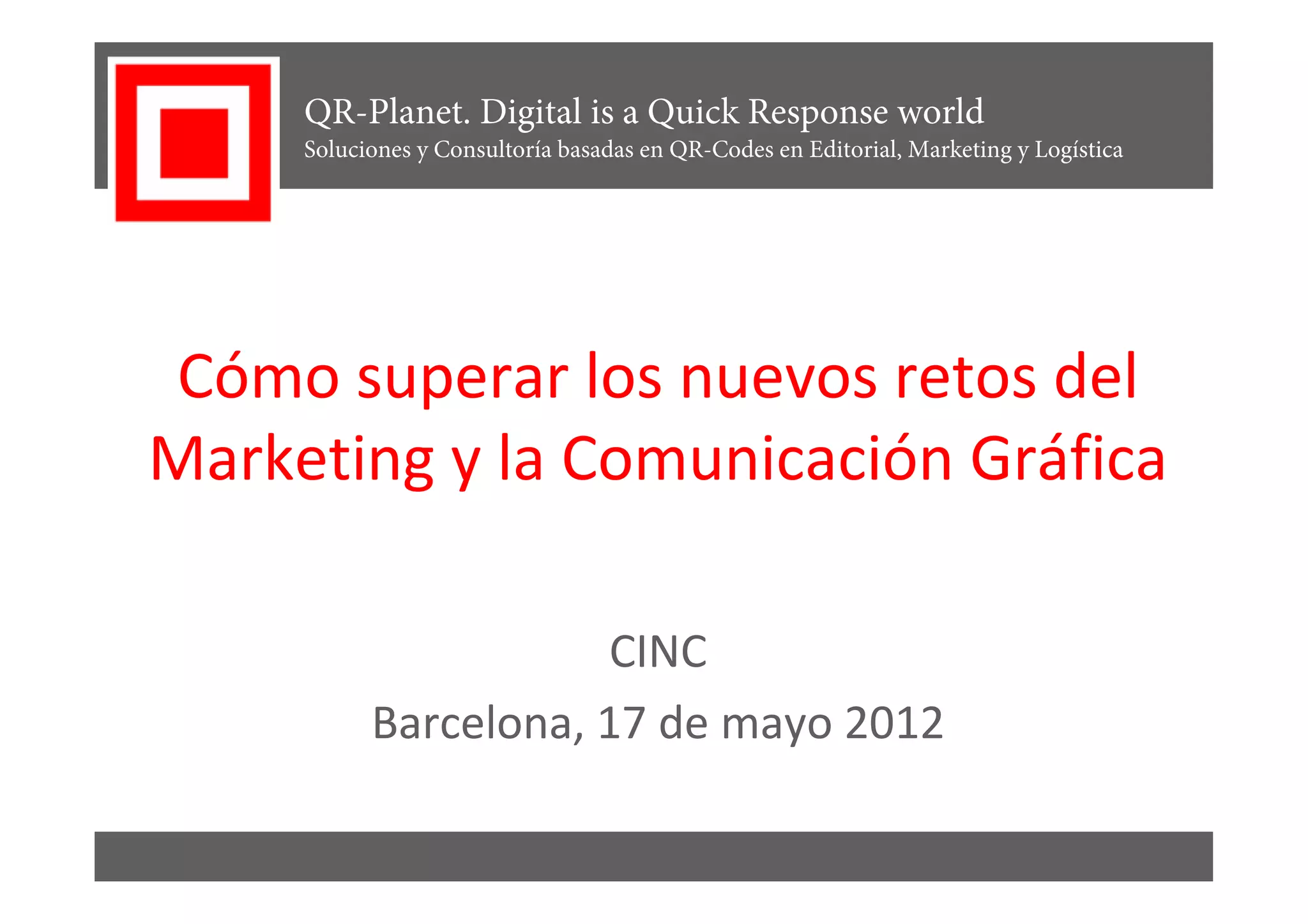 Este documento presenta sobre los códigos QR y su uso en el marketing y la comunicación gráfica. Explica que los códigos QR permiten vincular los soportes físicos con el contenido web de forma interactiva y eficiente para mejorar la métrica y conversión. También proporciona ejemplos de cómo varias empresas han tenido éxito al utilizar códigos QR para sus campañas.