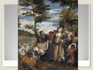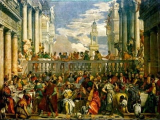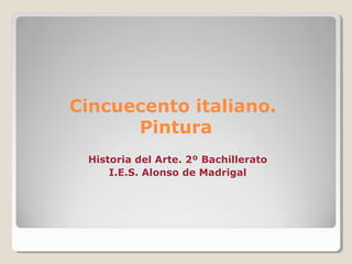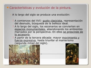 El documento describe la evolución de la pintura del Renacimiento italiano en el siglo XVI. Comienza con un estilo clasicista y la búsqueda de la belleza ideal, luego los escenarios se vuelven más monumentales y se prescinde de lo accesorio. Más adelante, hay mayor movimiento y fuerza expresiva con el surgimiento del manierismo. Luego analiza las obras de Miguel Ángel, Leonardo da Vinci, Rafael, Giorgione y Tiziano, destacando sus características técnicas y temáticas.