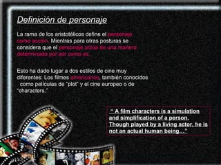 El documento define los conceptos de personaje cinematográfico, protagonista y antagonista. Explica las herramientas necesarias para construir buenos personajes como la necesidad dramática, el punto de vista, el cambio y la actitud. También describe las funciones de los personajes secundarios como confidente, catalizador y opinante. Finalmente, discute cómo se crean personajes complejos con biografías e interiores y exteriores bien desarrollados.
