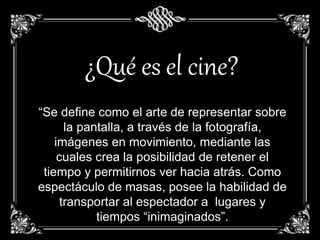 El documento describe la historia del cine desde sus orígenes hasta la actualidad. Comenzó como una forma de capturar imágenes en movimiento y luego se desarrolló para contar historias a través de películas. El cine también se ha utilizado para fines de propaganda y persuasión. Tiene un gran impacto emocional en los espectadores y ha influido en la sociedad de muchas maneras.