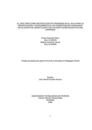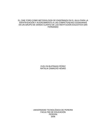 El documento presenta un proyecto que busca implementar el cine foro como metodología para identificar y acercar a las competencias ciudadanas en estudiantes de grado cuarto. El objetivo es utilizar películas para fomentar valores, actitudes y habilidades sociales a través de talleres y discusiones. Se espera que esta estrategia haga más atractivo el aprendizaje de estas competencias y ofrezca alternativas pedagógicas innovadoras.
