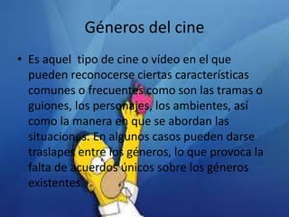 El documento habla sobre el género cinematográfico del cine infantil. Explica que este género va dirigido a los niños con fines didácticos o de entretenimiento, y que puede presentarse a través de dibujos animados, filmaciones reales o una mezcla de ambos. También menciona que algunas películas infantiles tienen una carga pedagógica para transmitir conocimientos o sensibilizar a los niños sobre determinados temas, y que aunque muchas son de animación, también existen películas infantiles con
