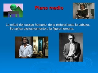 El documento describe los diferentes tipos de planos y ángulos de cámara utilizados en el cine y la televisión. Explica planos como el plano americano, plano medio, primer plano y gran primer plano, así como ángulos normales, altos y bajos. También describe diferentes movimientos de cámara como el paneo, el travelling y el zoom, y cómo se usan para transmitir información dramática o subjetiva.