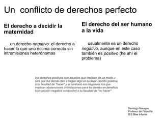 El documento presenta un debate filosófico sobre el aborto, analizando los argumentos a favor y en contra desde diferentes perspectivas como el momento en que empieza la vida humana, los derechos de la mujer frente al feto, y las implicaciones éticas de la legalización del aborto. También resume la posición de la ley española sobre el aborto y menciona algunas películas que han tratado el tema.
