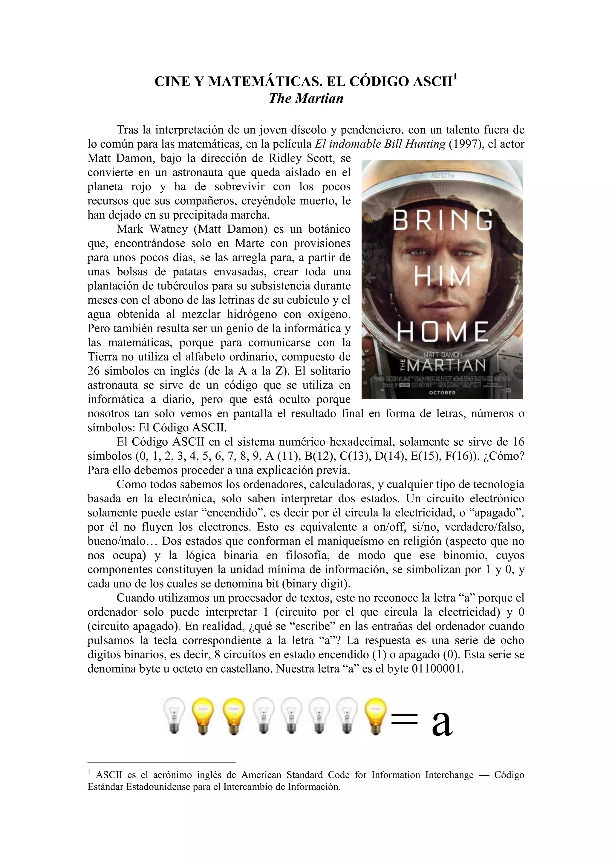 La película The Martian narra la historia de un astronauta, Mark Watney, que queda aislado en Marte. Para comunicarse con la Tierra y pedir ayuda, Watney utiliza el código ASCII hexadecimal, colocando símbolos en estacas alrededor de una cámara giratoria. Esto le permite enviar y recibir mensajes codificados que la Tierra luego traduce. Gracias a este ingenioso sistema y a la ayuda de la NASA, Watney logra sobrevivir hasta ser rescatado.
