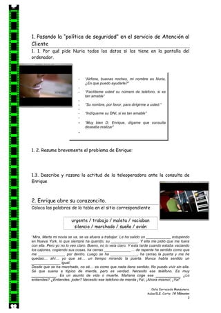 El documento presenta un análisis del cortometraje "10 Minutos" realizado por el director Alberto Ruiz Rojo. El corto muestra la conversación telefónica entre un hombre desesperado, Enrique, y una teleoperadora, Nuria. A lo largo de la llamada, Nuria va cambiando su actitud fría y profesional a una más humana y compasiva ante la desesperación de Enrique. El director critica la falta de contacto humano en los servicios de atención al cliente y cómo priman las normas sobre la flexibilidad y el entendimiento.