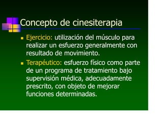La cinesiterapia implica el uso terapéutico del ejercicio para mejorar la función. Consiste en el mantenimiento y mejora del rango de movimiento articular, potenciación muscular, resistencia y control motor. Se utilizan movilizaciones pasivas, activas asistidas y activas libres para prevenir la pérdida de movilidad articular. La fuerza, resistencia y velocidad muscular pueden mejorarse a través de diferentes tipos de contracciones musculares.