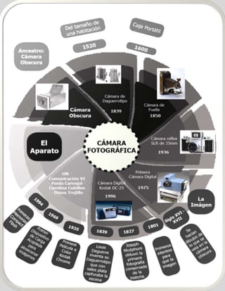 Este documento proporciona información sobre la evolución del cine y la cámara fotográfica. Explica los orígenes del cine en experimentos científicos del siglo XIX y los primeros aparatos para ver imágenes en movimiento. También resume los avances tecnológicos que llevaron al desarrollo de la cámara fotográfica y las películas sonoras. Por último, brinda detalles sobre festivales de cine como el de Cannes y películas actuales.