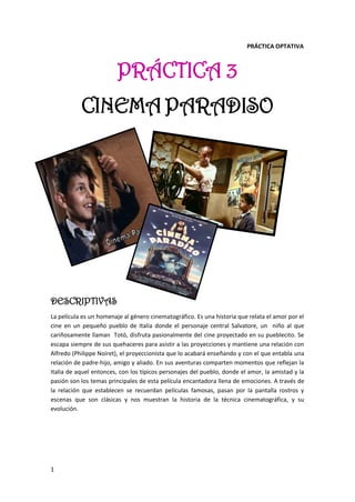 La película Cinema Paradiso es un homenaje al cine y cuenta la historia de un niño llamado Salvatore en un pequeño pueblo de Italia que disfruta apasionadamente de las proyecciones cinematográficas. Muestra su relación con el proyeccionista Alfredo, quien lo enseña y se convierte en un padre para él. A través de esta relación y de las películas que ven juntos, se recuerdan escenas y rostros icónicos que muestran la historia y evolución del cine.