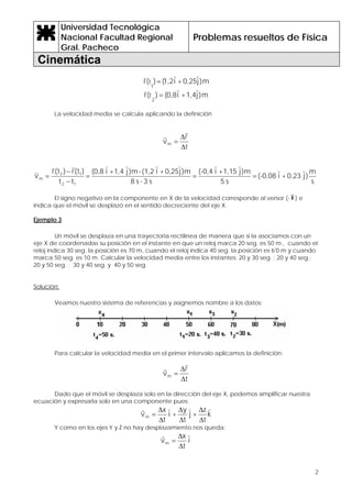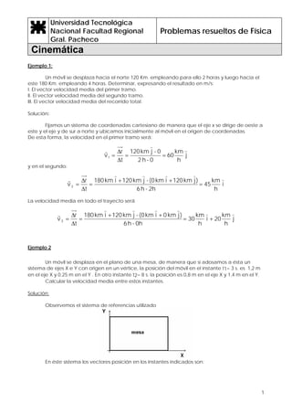 I. El documento presenta varios ejemplos resueltos de problemas de cinemática que involucran conceptos como velocidad media, aceleración y movimiento rectilíneo uniforme y uniformemente acelerado.