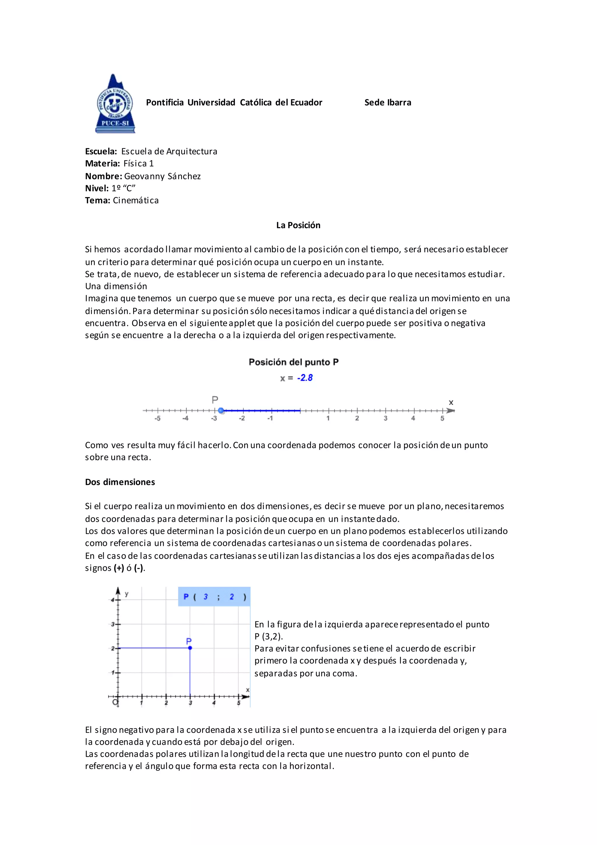Este documento trata sobre la cinemática y conceptos básicos como posición, desplazamiento, distancia, velocidad, rapidez y aceleración. Explica que la posición se determina mediante coordenadas y que para objetos que se mueven en una, dos o tres dimensiones se requiere una, dos o tres coordenadas respectivamente. También define la diferencia entre distancia, que es la longitud de la trayectoria, y desplazamiento, que es el cambio de posición. Finalmente, distingue entre velocidad, que es una magnitud vectorial que