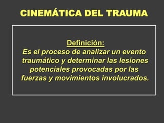 El documento describe la cinemática del trauma, que analiza eventos traumáticos para determinar las lesiones causadas por las fuerzas involucradas. Explica conceptos como energía cinética, mecanismos de lesiones cerradas y penetrantes, y tipos de lesiones asociadas a accidentes de tránsito, caídas, armas de fuego y explosiones. Además, identifica variables como la edad, consumo de sustancias y comorbilidades que afectan el riesgo de lesiones.