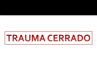 El documento habla sobre la cinemática del trauma, explicando conceptos como la inercia, la energía cinética, las fuerzas y los diferentes tipos de lesiones que pueden ocurrir dependiendo del mecanismo del trauma, como colisiones vehiculares, caídas, heridas por armas de fuego y explosiones. Describe brevemente los tres tipos de lesiones que puede haber en un accidente vehicular y cómo varían los daños dependiendo del tipo y velocidad del vehículo involucrado en el accidente.