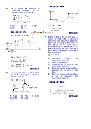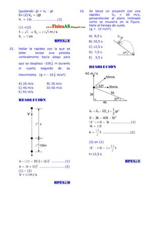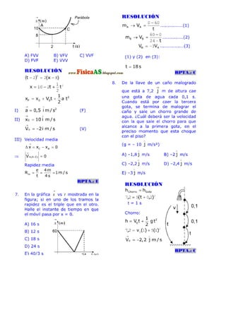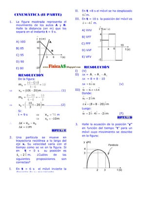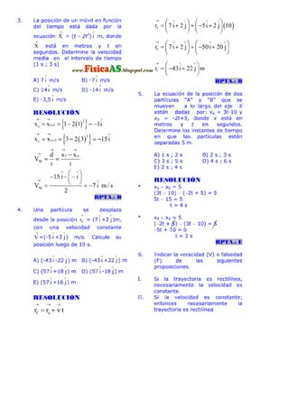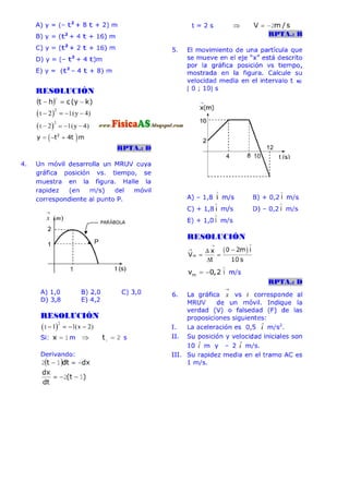 El documento contiene 20 problemas relacionados con el movimiento rectilíneo uniforme y acelerado. Los problemas involucran calcular distancias, velocidades, tiempos y ecuaciones de posición para partículas que se mueven con velocidad y aceleración constante. Se pide determinar valores numéricos, ecuaciones y verificar afirmaciones sobre el movimiento de los objetos.