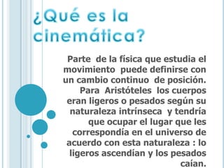 El documento presenta información sobre diferentes tipos de movimiento como el movimiento rectilíneo uniforme, movimiento armónico simple, movimiento parabólico y movimiento circular uniforme. Define conceptos clave como velocidad, aceleración, elongación y fuerzas asociadas a cada tipo de movimiento.