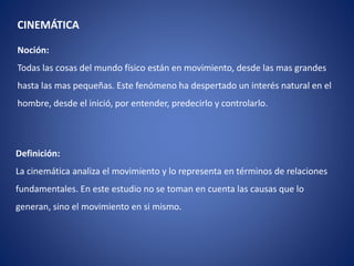 El documento trata sobre la cinemática, que analiza el movimiento sin considerar sus causas. Explica conceptos clave como posición, desplazamiento, velocidad, aceleración y movimiento rectilíneo uniforme. También presenta ejercicios de aplicación sobre estos temas.