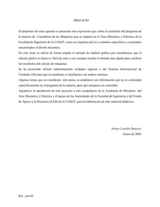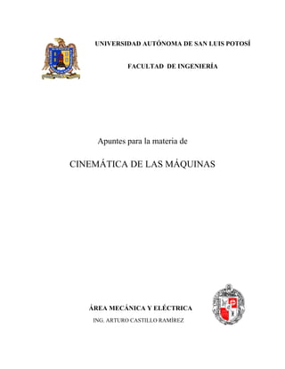 Este documento presenta los apuntes para la materia de Cinemática de las Máquinas impartida en la Facultad de Ingeniería de la Universidad Autónoma de San Luis Potosí. El propósito de los apuntes es cubrir el contenido del programa de la materia como un requisito previo para estudios avanzados de diseño mecánico. El documento incluye capítulos sobre análisis topológico de mecanismos, mecanismos de eslabones articulados, centros instantáneos, velocidad y aceler