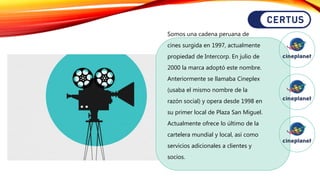 Grupo 9 es una cadena de cines peruana fundada en 1997 y actualmente propiedad de Intercorp. Anteriormente se llamaba Cineplex y operó por primera vez en 1998 en Plaza San Miguel. Su misión es convertirse en una de las tres mayores cadenas de cines de Sudamérica mediante la oferta de un excelente servicio. Su visión es ser la principal opción de entretenimiento que tenga un impacto positivo en la vida de las personas y la sociedad.