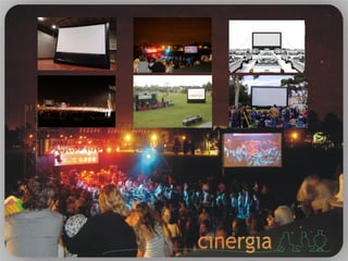 Cinergia es una empresa dedicada a proyecciones audiovisuales al aire libre, ofreciendo tecnología avanzada como pantallas inflables y proyectores DLP de alta definición. Sus servicios abarcan eventos como cine al aire libre, recitales, campañas políticas y publicidad, proporcionando soluciones integrales y creativas. La empresa trabaja con una amplia gama de clientes, incluidos municipios, empresas, y organizaciones, para generar experiencias audiovisuales memorables.