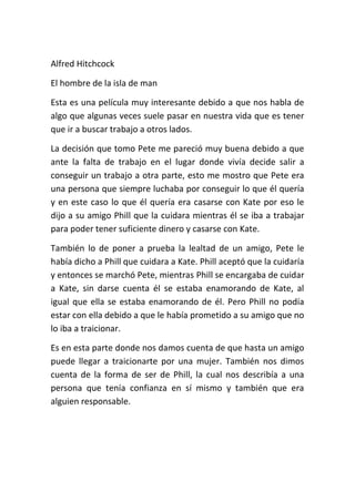 El documento resume la película "El hombre de la isla de man" de Alfred Hitchcock. Cuenta la historia de Pete, quien deja su pueblo para buscar trabajo y le pide a su amigo Phill que cuide de su prometida Kate. Con el tiempo, Phill y Kate se enamoran. Más tarde, se cree que Pete ha muerto, por lo que Phill y Kate inician una relación. Sin embargo, luego se descubre que Pete sigue vivo y regresa, casándose con Kate a pesar de que ella ya no lo ama. La película ofrece lecciones sobre la