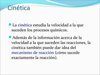 La cinética estudia la velocidad de los procesos químicos. La velocidad de reacción depende de factores como la concentración de los reactivos, la temperatura y la presencia de catalizadores. La cinética puede determinar el orden de una reacción y expresar matemáticamente cómo afectan estos factores a la velocidad a través de leyes de velocidad y la constante de velocidad.