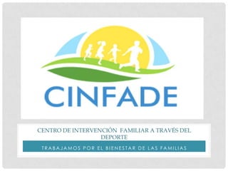 El documento describe el Centro de Intervención Familiar a través del Deporte (CINFADE), el cual busca mejorar el clima familiar en Colombia mediante técnicas psicológicas y actividades deportivas. CINFADE tiene como misión acompañar a las familias colombianas para formar personas integras y mejorar la unidad familiar, y como visión ser reconocido a nivel departamental para el 2015 por su contribución al mejoramiento familiar.