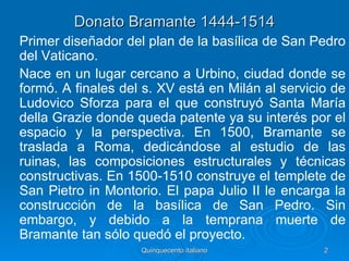Donato Bramante fue un arquitecto italiano del Renacimiento. Diseñó la basílica de San Pedro en el Vaticano y construyó el templete de San Pietro in Montorio en Roma. Bramante también trabajó en proyectos en Milán y Urbino antes de trasladarse a Roma en 1500, donde se dedicó al estudio de las ruinas clásicas. A pesar de que murió prematuramente en 1514, su influencia en la arquitectura renacentista fue enorme.