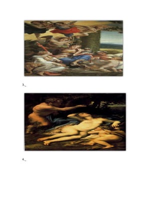 Este documento presenta información biográfica y obras destacadas de varios artistas renacentistas italianos como Correggio, Miguel Ángel, Leonardo da Vinci y Donato Bramante. Para Correggio, destaca sus frescos en Parma. Miguel Ángel es conocido por esculturas como la Piedad y la Batalla de los Centauros, así como por su trabajo arquitectónico en la basílica de San Pedro. Leonardo da Vinci realizó un boceto para un monumento inacabado. Finalmente, obras arquitectónicas dest