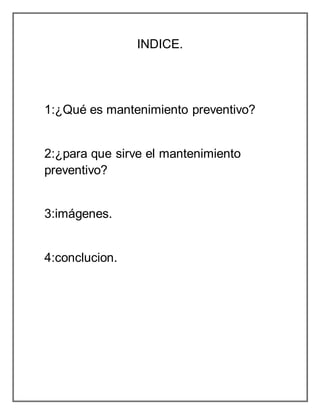 El documento habla sobre el mantenimiento preventivo. Explica que el mantenimiento preventivo se realiza en equipos en buen funcionamiento para evitar fallas mediante revisiones y reparaciones periódicas. También describe que el mantenimiento preventivo ayuda a extender la vida útil de los equipos hasta en un 50%, mejora la productividad hasta en un 25% y reduce los costos de mantenimiento en un 30%. Finalmente, concluye resaltando la importancia de realizar mantenimiento preventivo cada 6 meses a las computadoras para prevenir problemas técnicos.