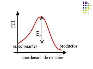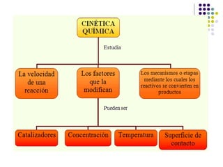 1) La cinética química estudia la velocidad de las reacciones químicas y los factores que la controlan. 2) La velocidad de reacción depende de la concentración de los reactivos y la energía de activación requerida. 3) Factores como la temperatura, concentración, estado de división y catalizadores afectan la velocidad al modificar la energía de colisión de las moléculas.
