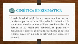 La cinética enzimática estudia la velocidad de las reacciones químicas catalizadas por las enzimas. Las enzimas son proteínas que pueden manipular otras moléculas llamadas sustratos uniéndose a ellos. La velocidad de la reacción aumenta a medida que aumenta la concentración de sustrato hasta alcanzar la saturación de la enzima.