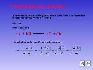 El documento describe los factores que afectan la velocidad de una reacción química. Explica que la velocidad depende de la teoría de colisiones entre moléculas y la energía de activación requerida. Los factores incluyen el estado físico y concentración de los reactivos, la temperatura, y la presencia de catalizadores, los cuales pueden aumentar o disminuir la energía de activación necesaria.