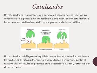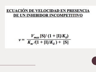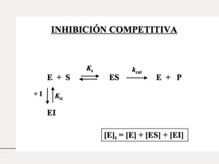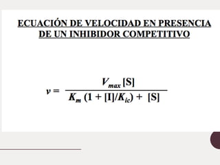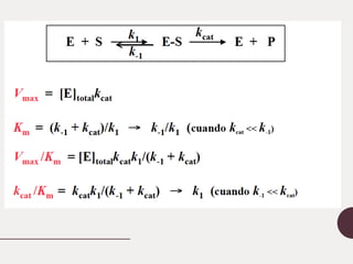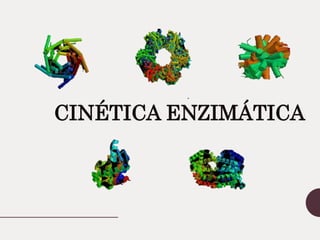 Este documento describe la cinética enzimática. Explica que los catalizadores como las enzimas aceleran las reacciones químicas sin ser consumidos. Luego describe la teoría de Michaelis-Menten sobre cómo las enzimas siguen una cinética de saturación, con parámetros como la velocidad máxima y la constante de Michaelis. Finalmente, explica cómo las enzimas pueden catalizar reacciones con múltiples sustratos siguiendo mecanismos secuenciales u ordenados.