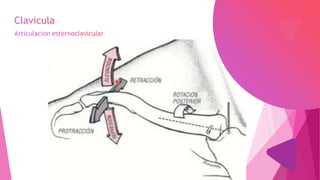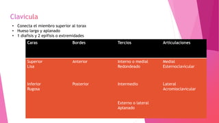La clavícula conecta el miembro superior al tórax. Tiene forma alargada y aplanada, con una diafisis y dos extremidades articulares. Se articula medialmente con el esternón a través de la articulación esternoclavicular y lateralmente con la escápula a través de la articulación acromioclavicular. La escápula es un hueso triangular aplanado situado en la parte posterior del tórax, con impresiones anatómicas como la fosa subescapular y la espina. Se articula con el húmero en la cav