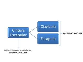Este documento describe las articulaciones del hombro, incluyendo la esternoclavicular, acromioclavicular y glenohumeral. Describe las superficies articulares, capsulas, ligamentos y otros tejidos de soporte de cada articulación. En la articulación esternoclavicular hay ligamentos anterior y posterior. La articulación acromioclavicular tiene ligamentos superior e inferior y uniones coracoclaviculares. La articulación glenohumeral tiene una cavidad glenoidea en el omoplato y cabeza esférica del humero,