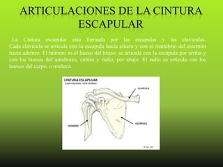 Este documento presenta información sobre la anatomía de la cintura escapular y el miembro superior. Describe las articulaciones de la clavícula con la escápula y el esternón, así como la articulación del hombro entre el húmero y la escápula. También detalla los huesos que componen estas articulaciones como la escápula, clavícula y húmero, así como sus partes y funciones.